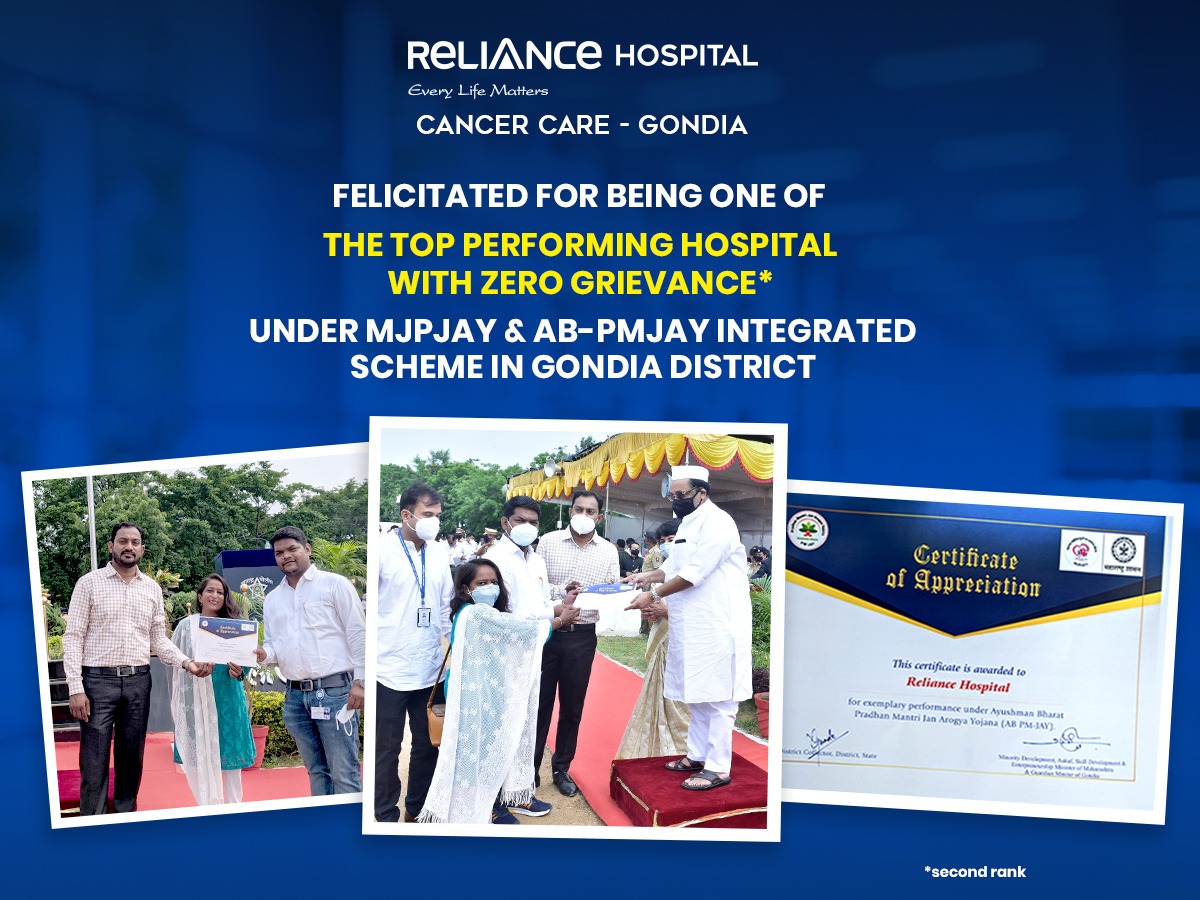 Kokilaben Dhirubhai Ambani Hospital, Cancer Centre, Gondia is awarded for being the second top-performing hospital with "0" grievance under MJPJAY and AB-PMJAY integrated scheme in Gondia district. The silver certification was provided by Hon. Nawab Malik, Minority Development, Aukaf, Skill Development and Entrepreneurship Minister of Maharashtra and also the guardian minister of Gondia in presence of Mrs.Nayana A Gunde, Hon. Collector, Gondia and Mr. Vishwa Pansare, SP, Gondia. A special thanks to integrated team MJPJAY and AB-PMJAY especially DC, Dr. Jayanti Patle, DMO, Dr. Poornima Paitehi, and DH, Mr. Manoj Patle for their continuous support.